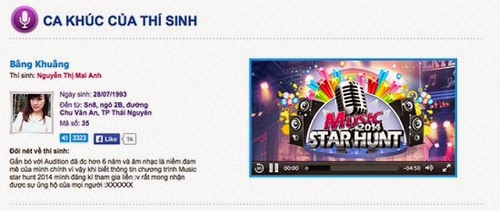 Chủ nhân của ca khúc “Bâng Khuâng” – một trong những bài dự thi nhận được nhiều like nhất, bạn Mai Anh chia sẻ: “Gắn bó với Audition đã đc hơn 6 năm và âm nhạc là niềm đam mê của mình. Chính vì vậy khi biết thông tin chương trình Music star hunt 2014, mình đăng kí tham gia liền. Rất mong nhận được sự ủng hộ của mọi người.”