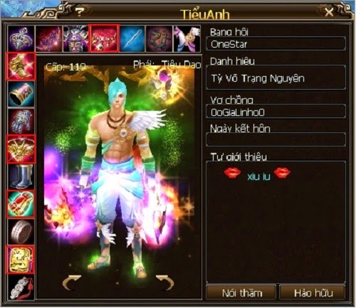 Mỗi khi nhắc đến cái tên này, cộng đồng game thủ không khỏi ấn tượng với thành tích một mình chống lại liên minh hùng mạnh toàn cõi của HươngPhi – Boss Nga My nổi tiếng thời bấy giờ. Anh cũng là ngườitiên phong trong việc sử dụng Tiềm Năng Chân Đan để thay đổi chỉ số nhân vật. Đồng thời, nhân vật này còn sở hữu hàng loạt bảo bối quý giá như bộ 05 Trùng Lâu: Kiên – Đới – Liên – Ngọc – Giới, toàn thân full ngọc 7. Ngoài ra kỹ năng PK xuất quỷ nhập thần cũng là 01 trong những dấu ấn làm nên tên tuổi của Tiểu Anh.