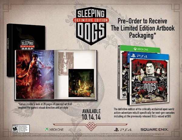 Sleeping Dogs: Definitive Edition sẽ được bán bao gồm đầy đủ toàn bộ bản mở rộng DLC đã từng ra mắt của mình và một quyển sách tranh art-book bao gồm những hình ảnh thiết kế về thế giới của tựa game Sleeping Dogs khi người chơi đặt mua tựa game này.