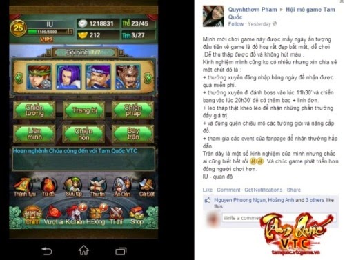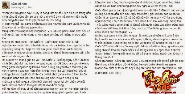 “Thám thính” một vòng group Hội mê game Tam Quốc, cảm nhận đầu tiên chính là không khí sôi nổi và hào hứng. Từ người đã “nằm gai nếm mật” những ngày đầu tại server Xích Bích, cho tới các game thủ chinh chiến server Quan Độ và cả mới gia nhập cộng đồng ở server Hổ Lao, tất cả đều cực kỳ hào hứng “góp miệng”, chia sẻ cảm nhận và kinh nghiệm của mình đối với Tam Quốc VTC. Tất cả đều xuất phát từ tình yêu thực sự của game thủ với Tam Quốc VTC, mong muốn gắn bó lâu dài với và giúp game ngày càng hoàn thiện. Và một điều đáng ngạc nhiên là tựa game chiến thuật tưởng như “khó nhằn” này lại rất được lòng các game thủ nữ.