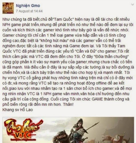 Game thủ có nick Khang tại server Hổ Lao đã thẳng thắn nhận xét về Tam Quốc VTC: “Ở đây “Đôla thần chưởng” cũng góp phần không ít vào sự mạnh yếu của gamer, nhưng chưa chắc có tiền là đã mạnh. Mà điều cần ở đây là sự sắp xếp các tướng, là sự bồi dưỡng,là chiến hồn và là cách bày trận như thế nào cho hợp lý và mạnh nhất”. Cùng với đó, Khang cũng dành nhiều lời khen ngợi cho Tam Quốc VTC: “Gamer chúng tôi chỉ cần 1 thể loại game vừa hấp dẫn và có tính cộng đồng cao,đặc biệt là “không hút máu” mà các gamer vẫn có thể trải nghiệm được tất cả các tính năng mà Game đem lại. Và Tôi thấy Tam Quốc VTC đã phát triển đúng các yếu tố “Cần và Đủ” cho gamer. Tôi rất thích cảm giác mà VTC đã đem đến cho tôi.”