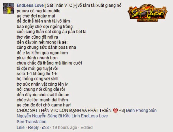 Sở hữu hàng loạt tính năng hấp dẫn, ngay từ những ngày đầu hé lộ thông tin, Sát Thần VTC đã nhận được sự quan tâm đặc biệt của cộng đồng game thủ. Hàng ngày trên Fanpage là hàng loạt những comment thắc mắc về tính năng game, háo hức chờ ngày ra mắt chính thức. Không phụ sự chờ đợi đó, đúng 11h02’ ngày 16/09/2014, tựa gMO thể loại MMOARPG mới nhất của NPH VTC Game đã chính thức lộ diện chào đón game thủ cùng tham gia trải nghiệm trên Android, iOS và giả lập PC