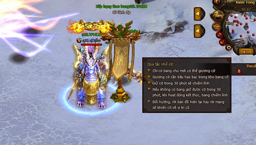 Bởi hình hức thi đấu khắc nghiệt ấy, khi tham chiến, Bang chủ nên dùng tất cả các loại thuốc tăng lợi ích cùng túi sinh lực. Thậm chí ở một vài trường hợp, để đẩy nhanh thân thủ, vượt thoát loạn sát, nhân vật này nên sử dụng các trang bị phòng thủ, né tránh hoặc sinh lực nhằm tăng độ “trâu” để không bị mất cờ. Sau khi Bang chủ đã chiếm cờ nên gấp gáp tìm nơi trú ẩn, không nên thi triển công phu, ra mặt tấn công. Vì kháng cự khi bốn bề thọ địch “đã đông còn nguy hiểm” là chuyện chẳng đặng đừng và không mấy khôn ngoan. Huynh đệ trong bang phải tập trung toàn lực xung quanh, sẵn sàng hi sinh để “hộ giá” Bang chủ. Bằng mọi cách bảo vệ cả người và cờ.