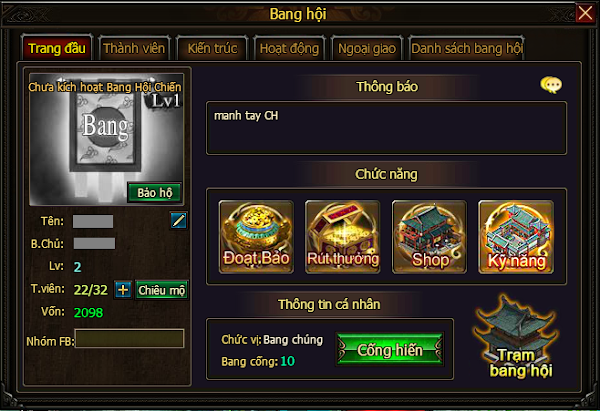 Vậy làm sao để có thể dựng xây một bang hội mạnh? Trước hết mỗi thành viên trong bang cũng như bang chủ phải hiểu rõ cơ cấu bang hội và các lợi ích mà bang hội sẽ mang lại chung cho các thành viên.