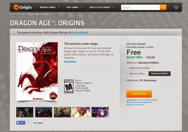 Hãng EA mới đây đã cho phép người dùng tải về miễn phí tựa game Dragon Age: Origins phiên bản Standard Edition thông qua dịch vụ Origin từ nay tới ngày 14 tháng 10. Được coi là một động thái tích cực vào thời điểm Dragon Age: Inquisition sắp ra mắt, có vẻ như EA muốn người dùng được “làm quen” với phiên bản đầu tiên trước khi “tậu” cho mình phần mới nhất.